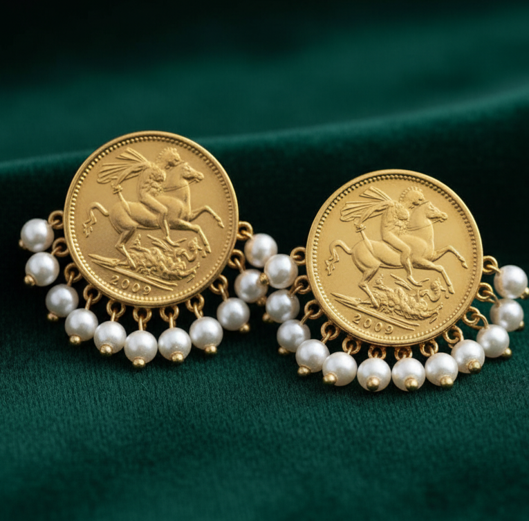 These opulent coin stud earrings feature an antique-finish gold medallion adorned with luminous pearl accents, embodying timeless elegance and noble restraint. Inspired by classical heritage jewelry, the design reflects regal sophistication that feels both historic and effortlessly modern.