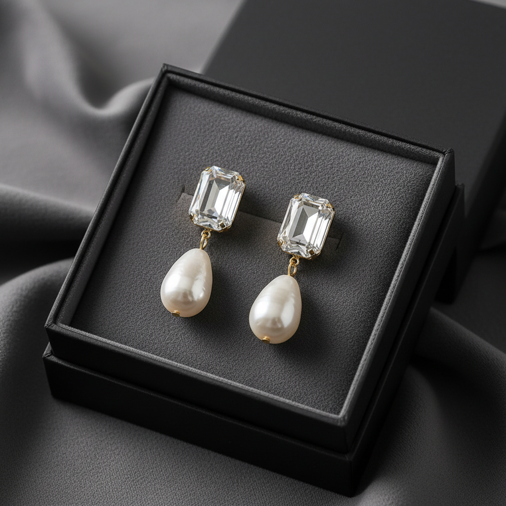 An emerald-cut clear crystal crowns the design, chosen for its exceptional light reflection and clean, architectural lines. Suspended below, a luminous teardrop pearl adds softness and movement, creating a refined contrast that feels timeless yet contemporary.