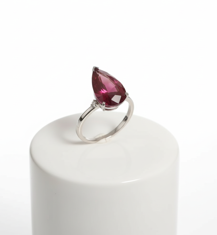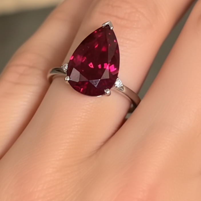 Designed to captivate, the Sapphire Crimson Ring showcases a radiant pear-cut crimson sapphire, glowing with rich depth and intensity. Set in a sleek white rhodium–plated band, the graceful teardrop silhouette enhances sophistication, while delicate zirconia accents add a refined sparkle. This ring embodies bold romance fused with timeless luxury.